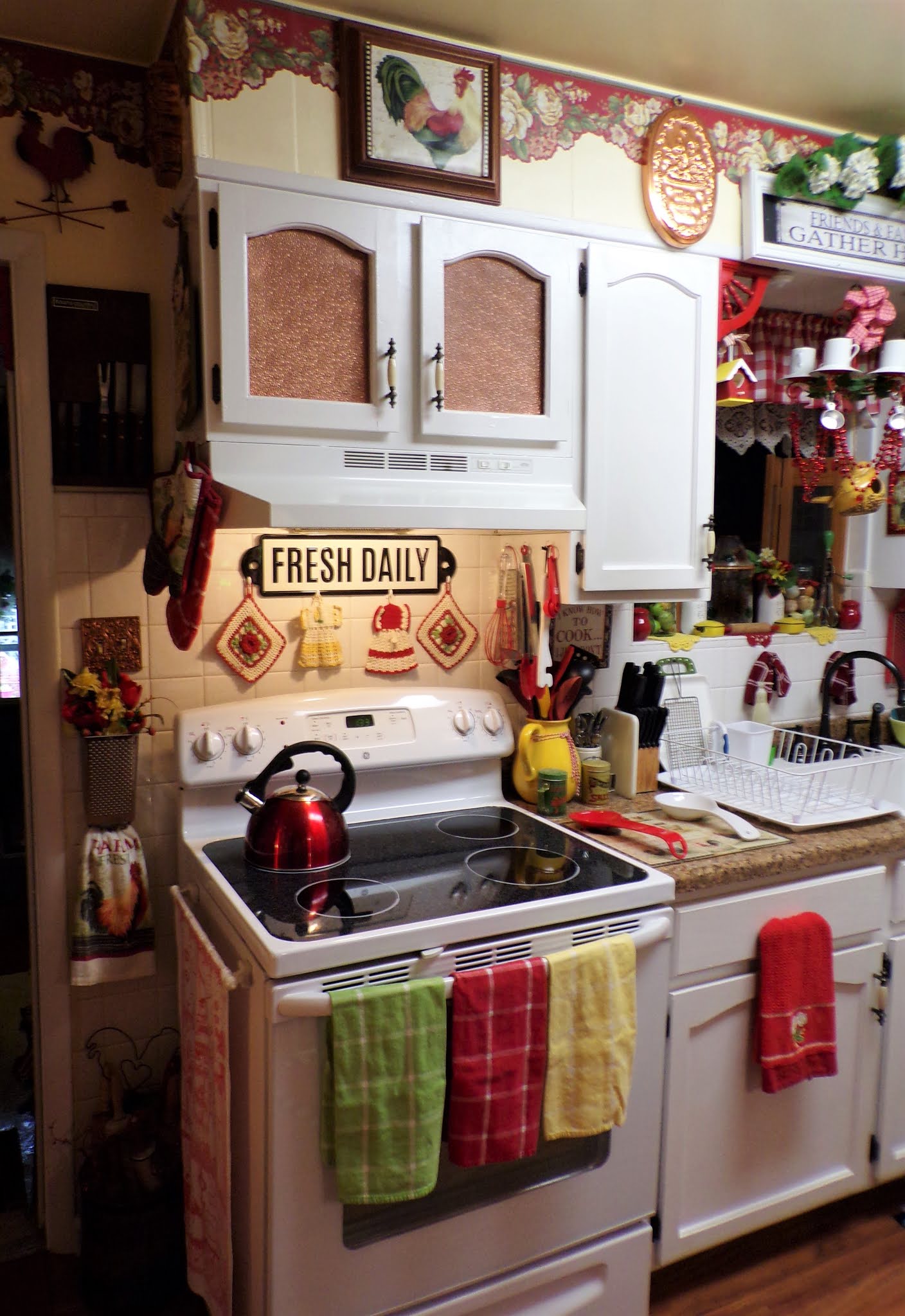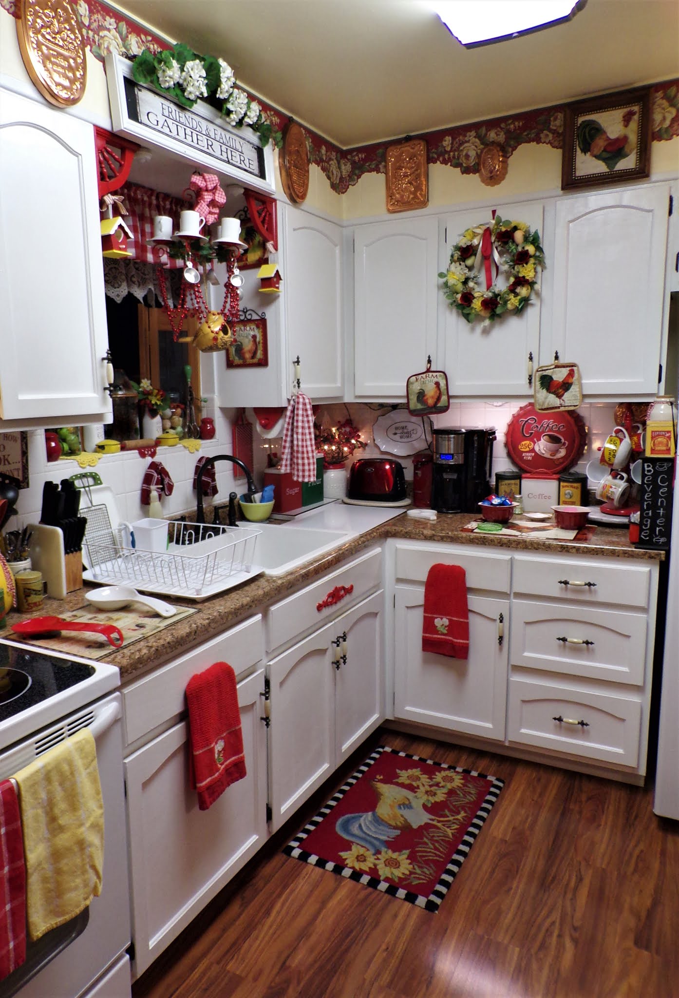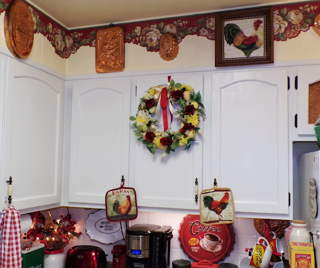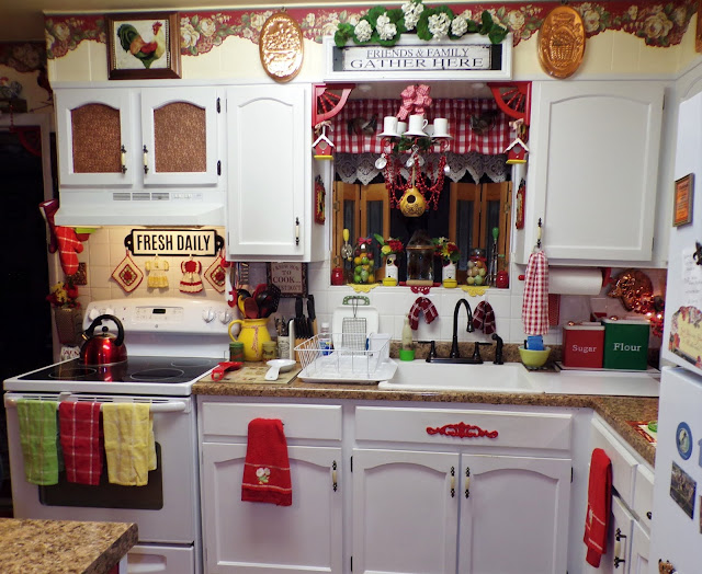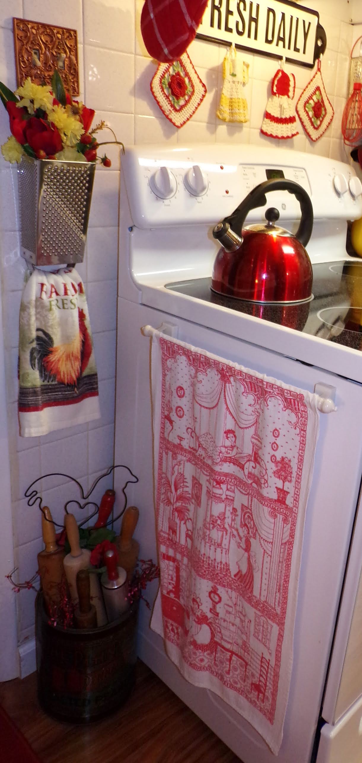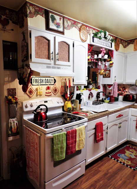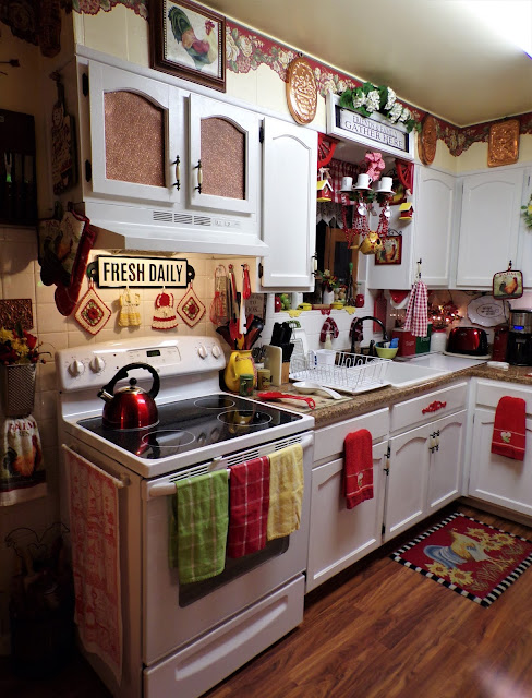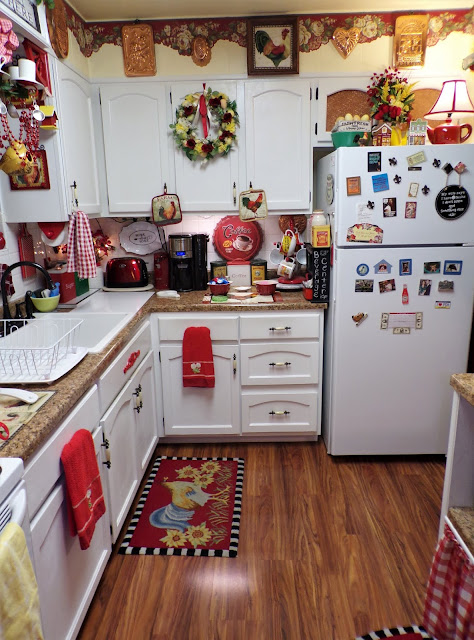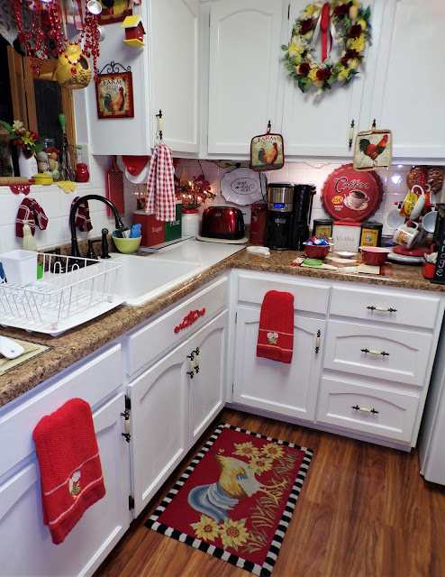 Cute red dish towels with flowers on them hung from the handles of the cabinets and "Chicken" rugs that I bought at J.C. Penney's when we remodeled our Kitchen about 10 years ago......