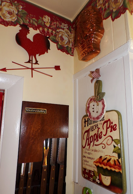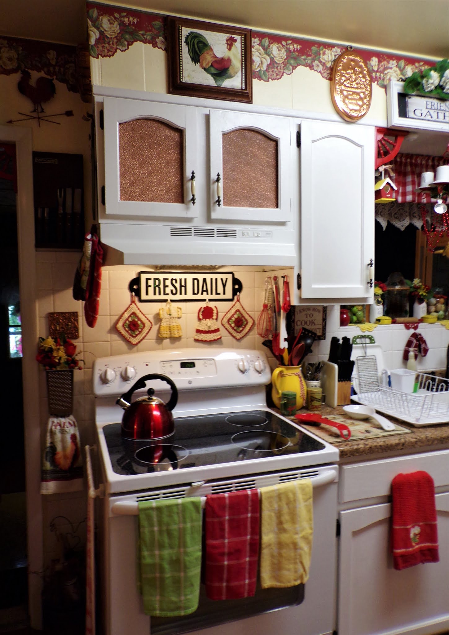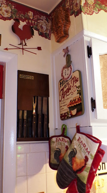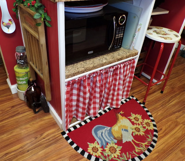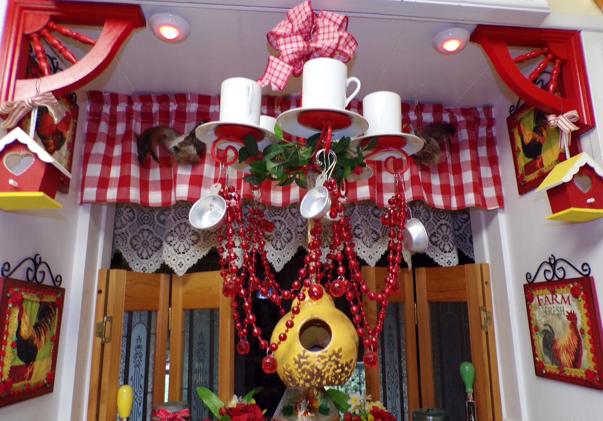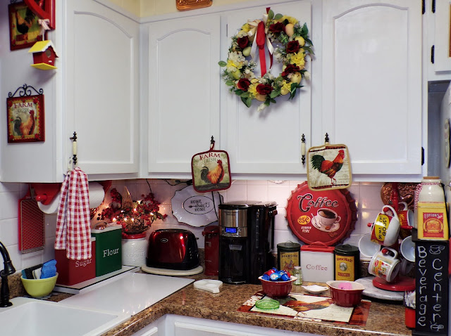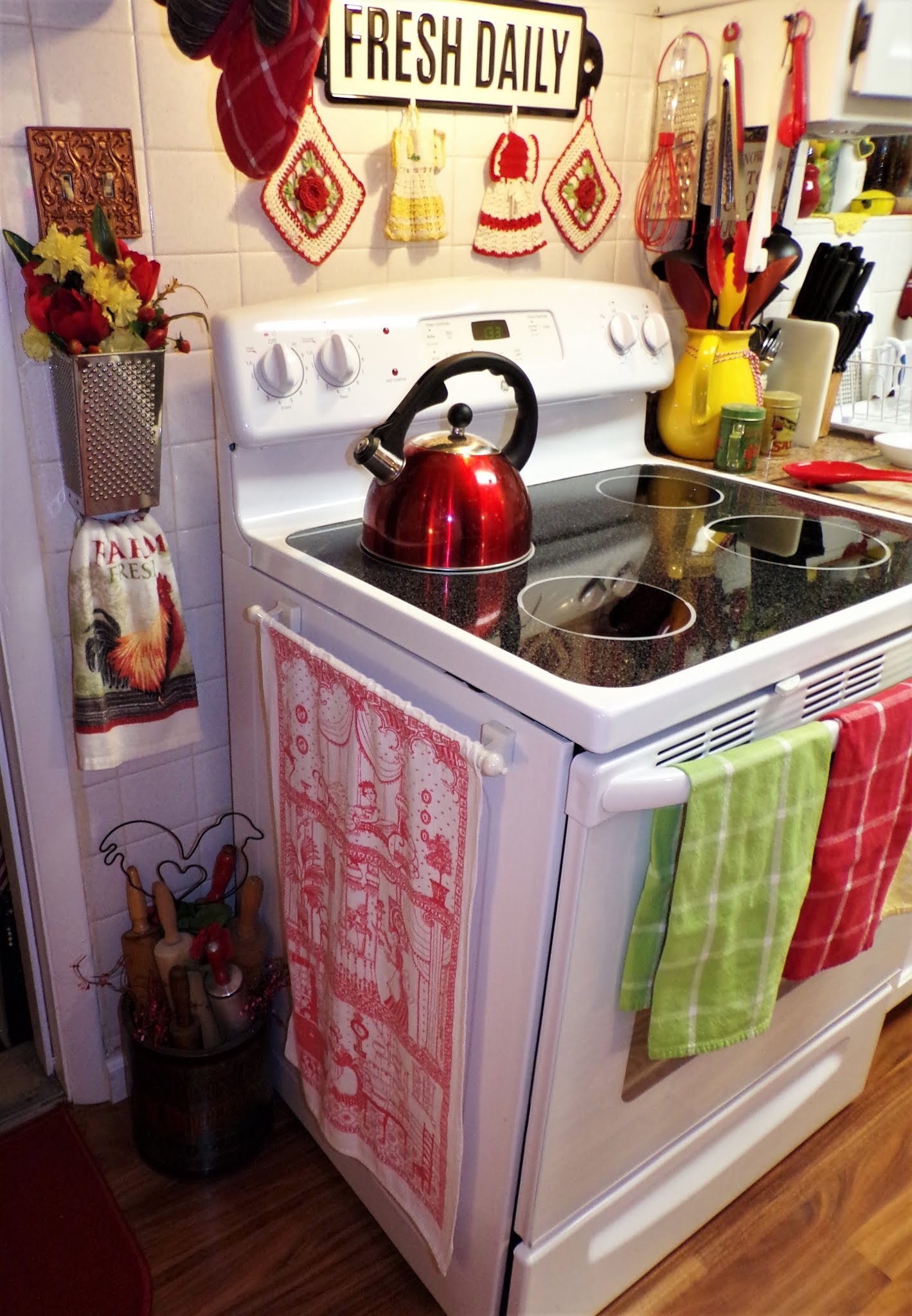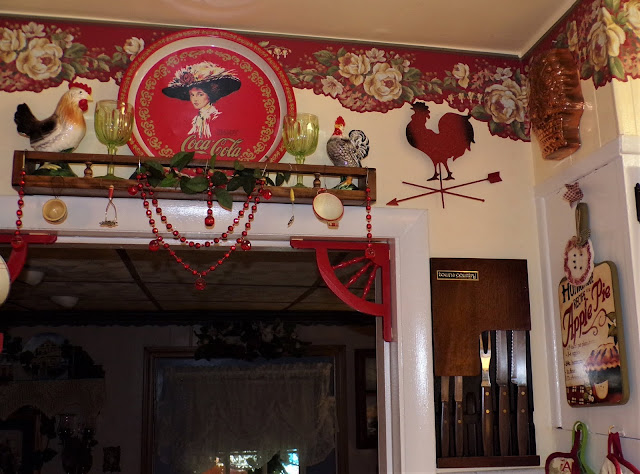 Cute red dish towels with flowers on them hung from the handles of the cabinets and "Chicken" rugs that I bought at J.C. Penney's when we remodeled our Kitchen about 10 years ago......