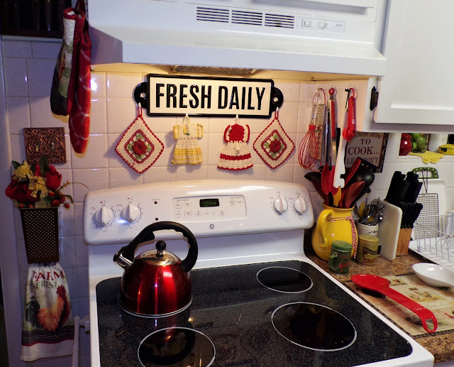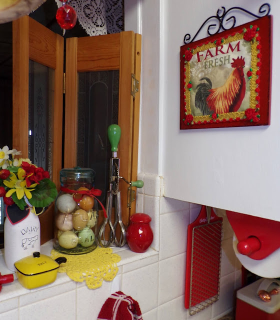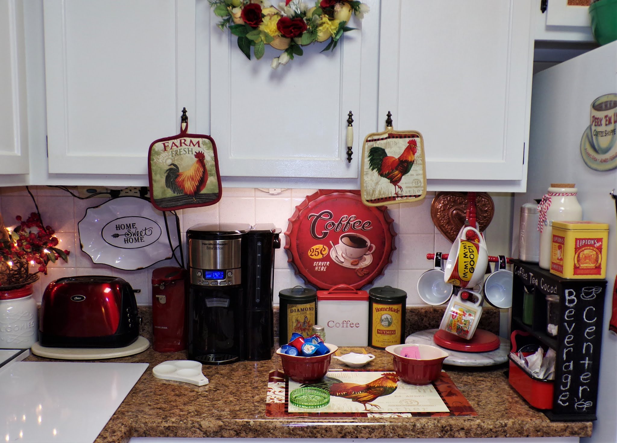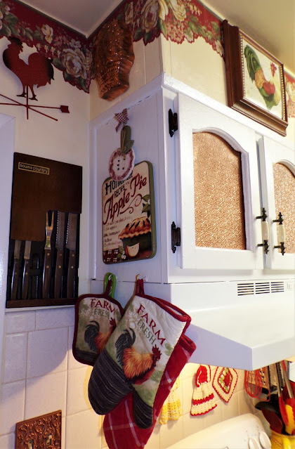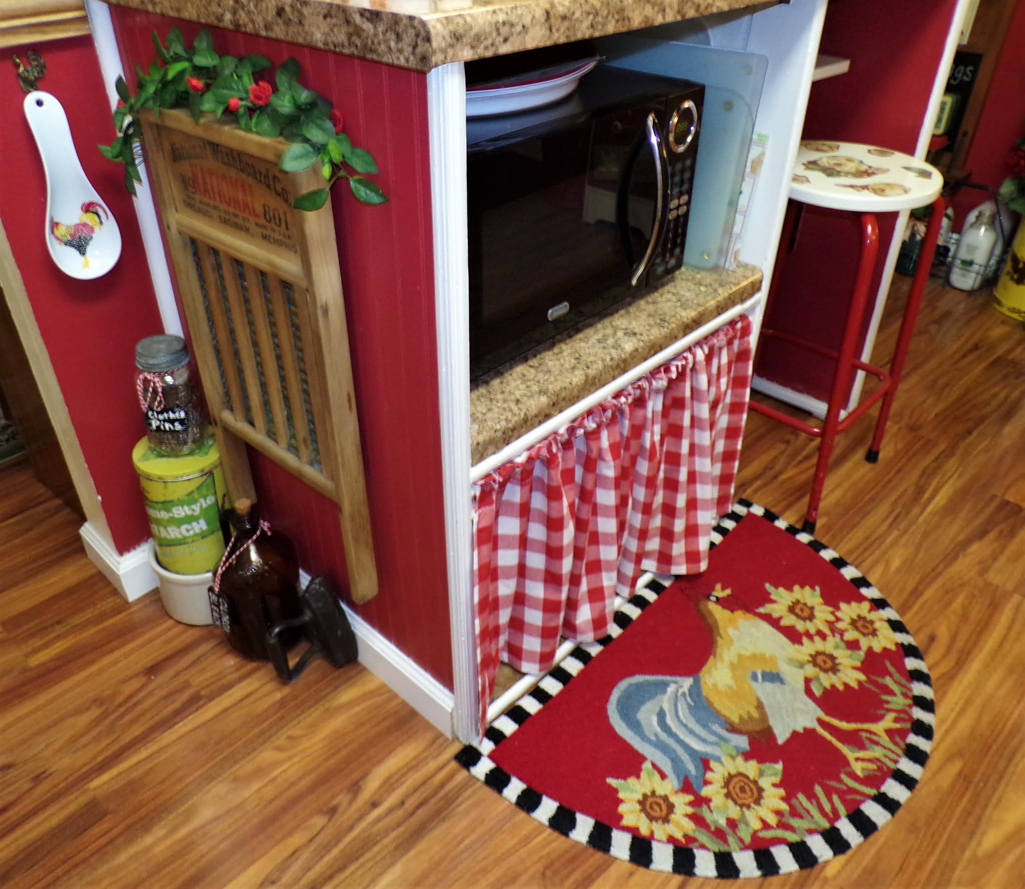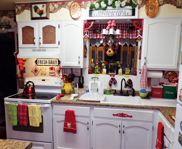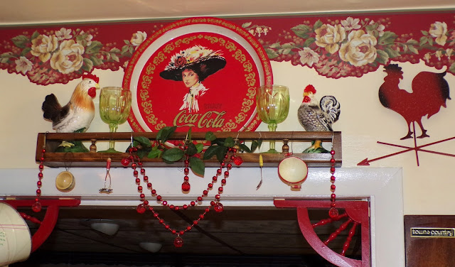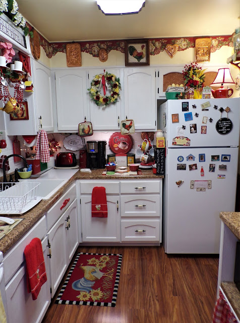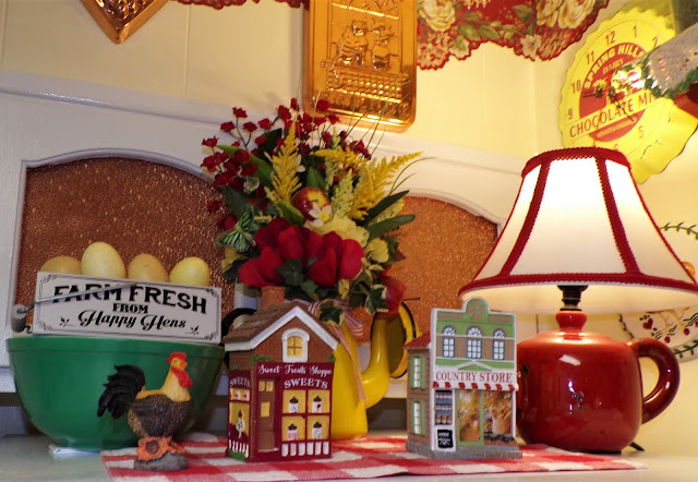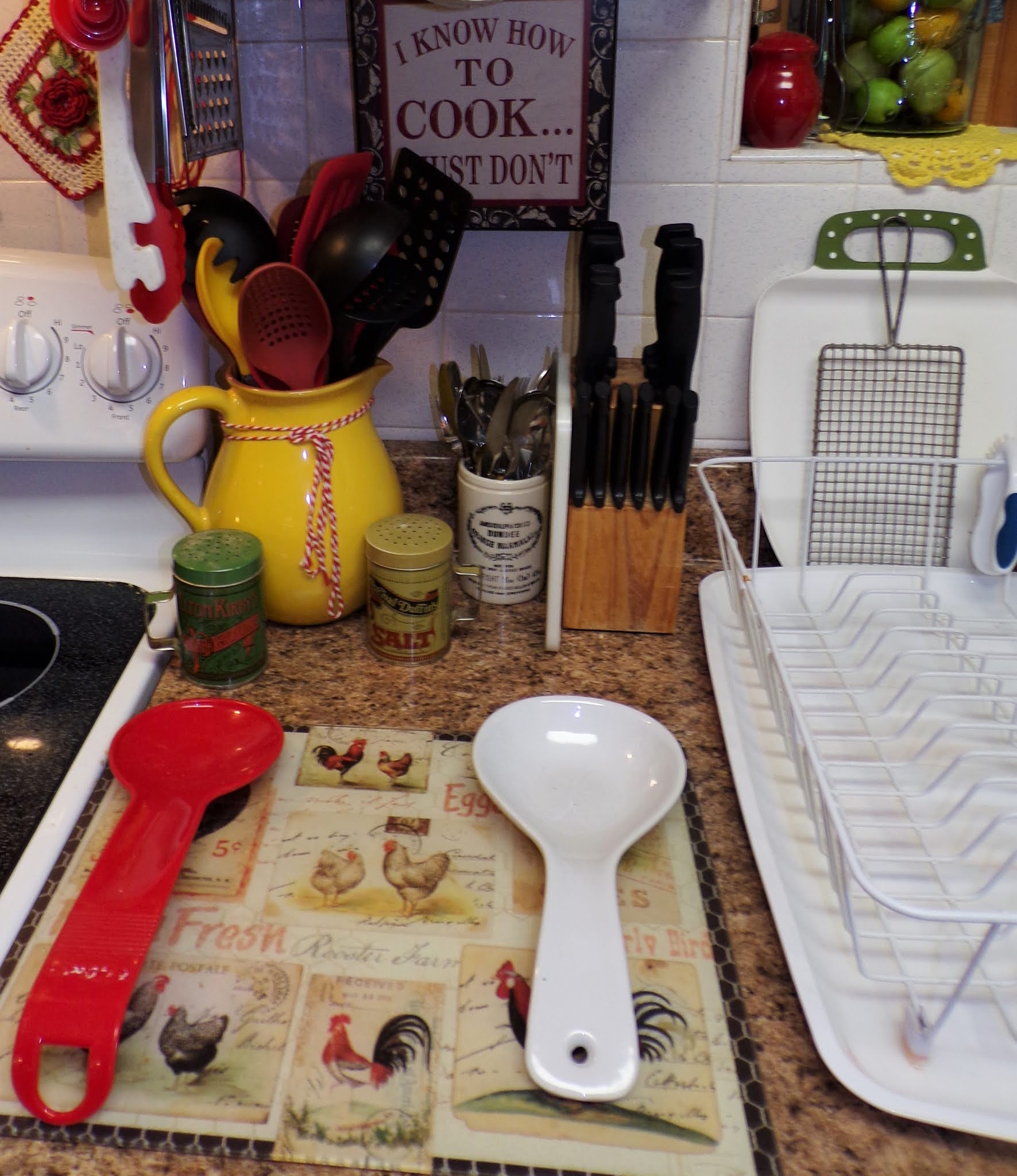 Cute red dish towels with flowers on them hung from the handles of the cabinets and "Chicken" rugs that I bought at J.C. Penney's when we remodeled our Kitchen about 10 years ago......