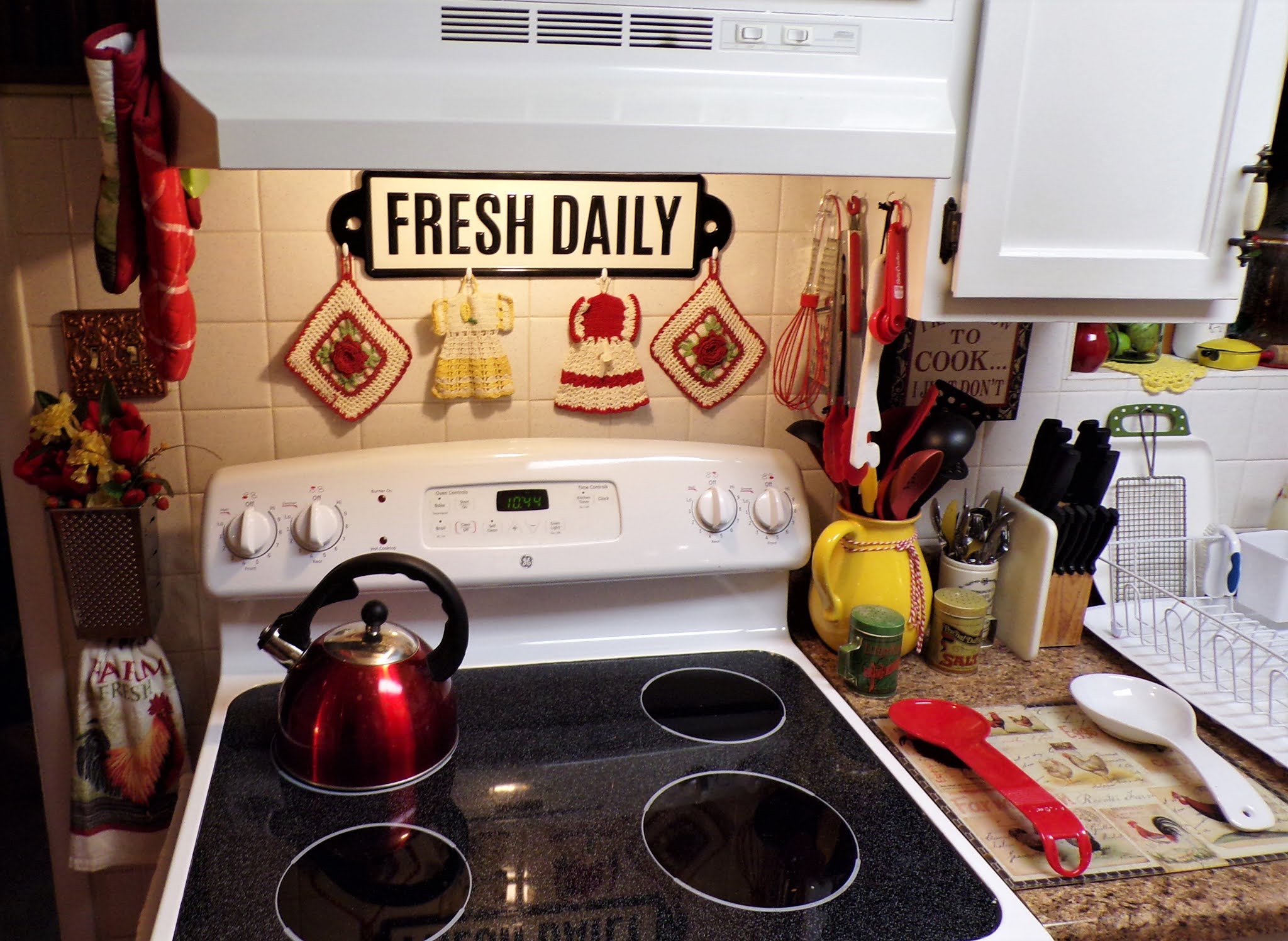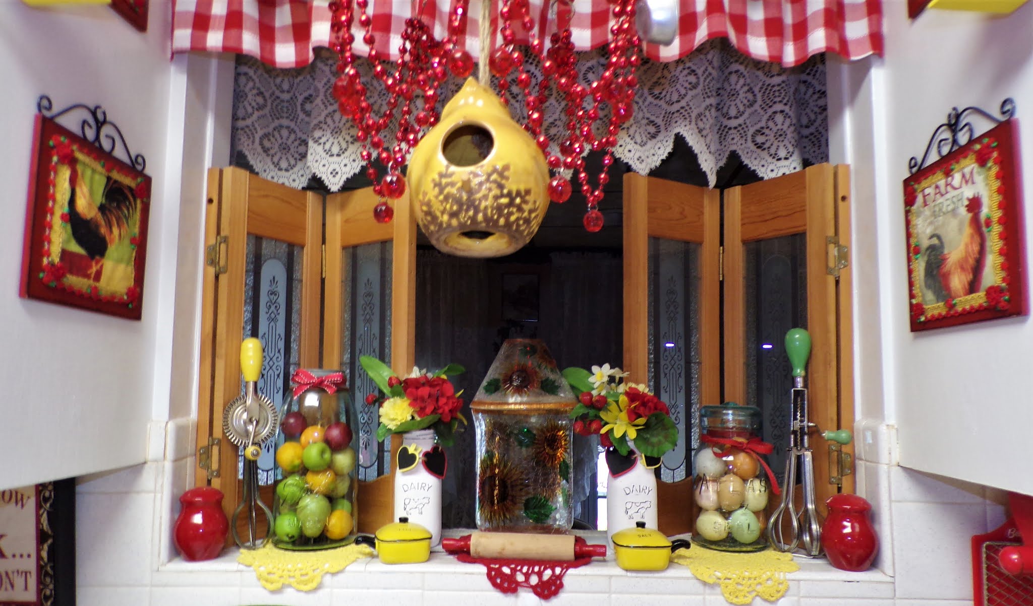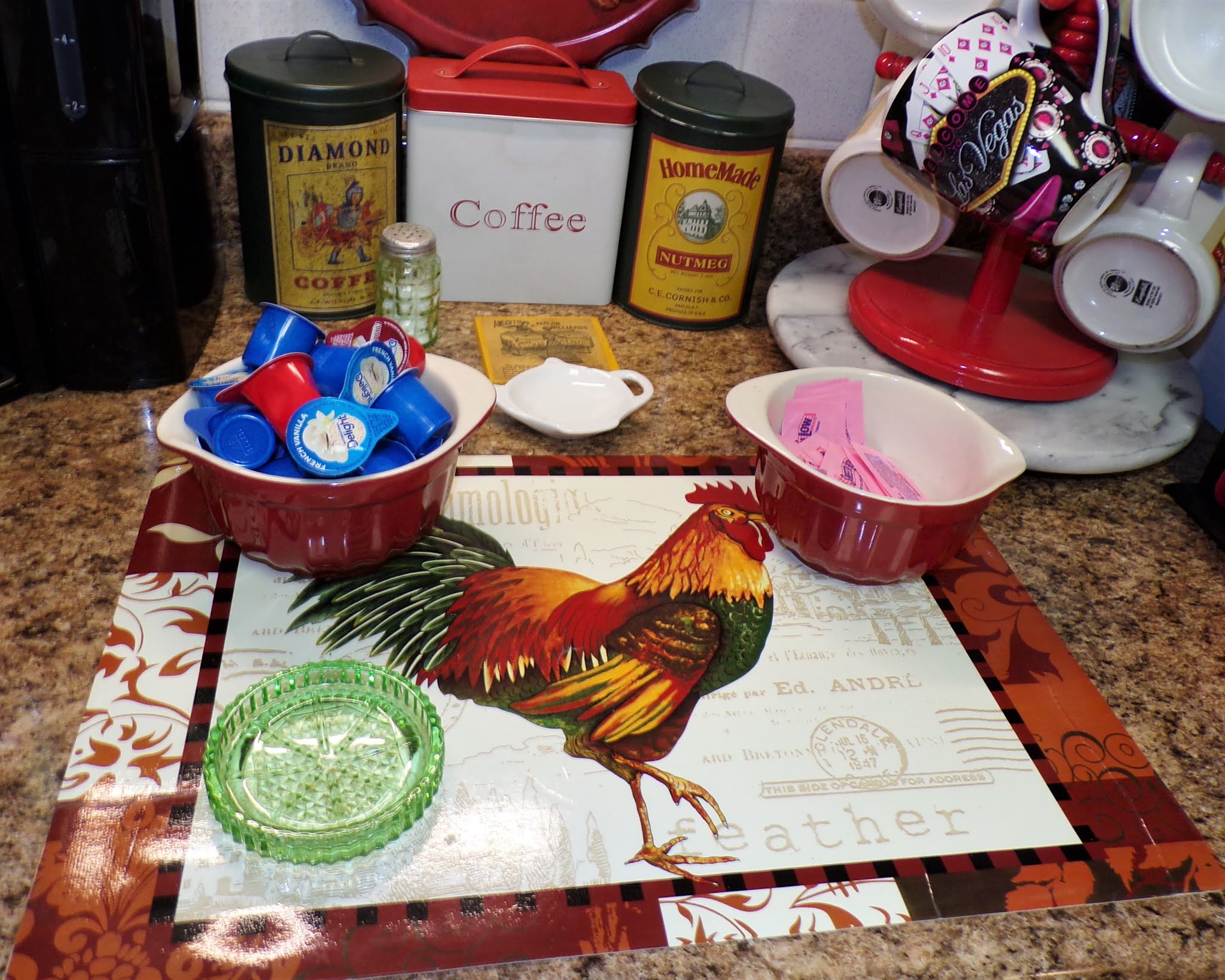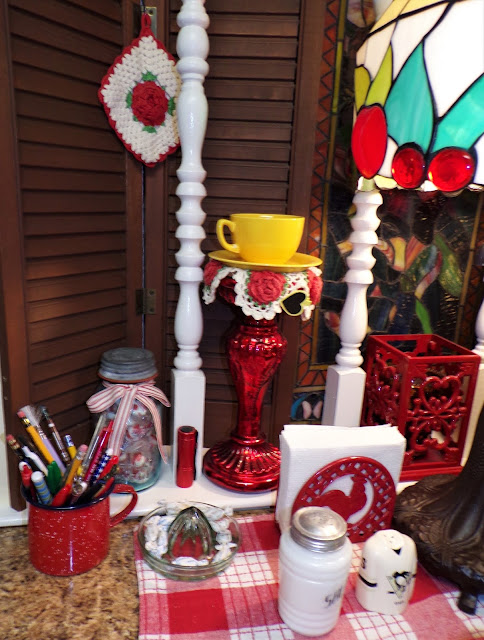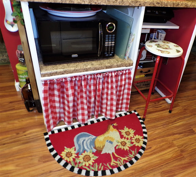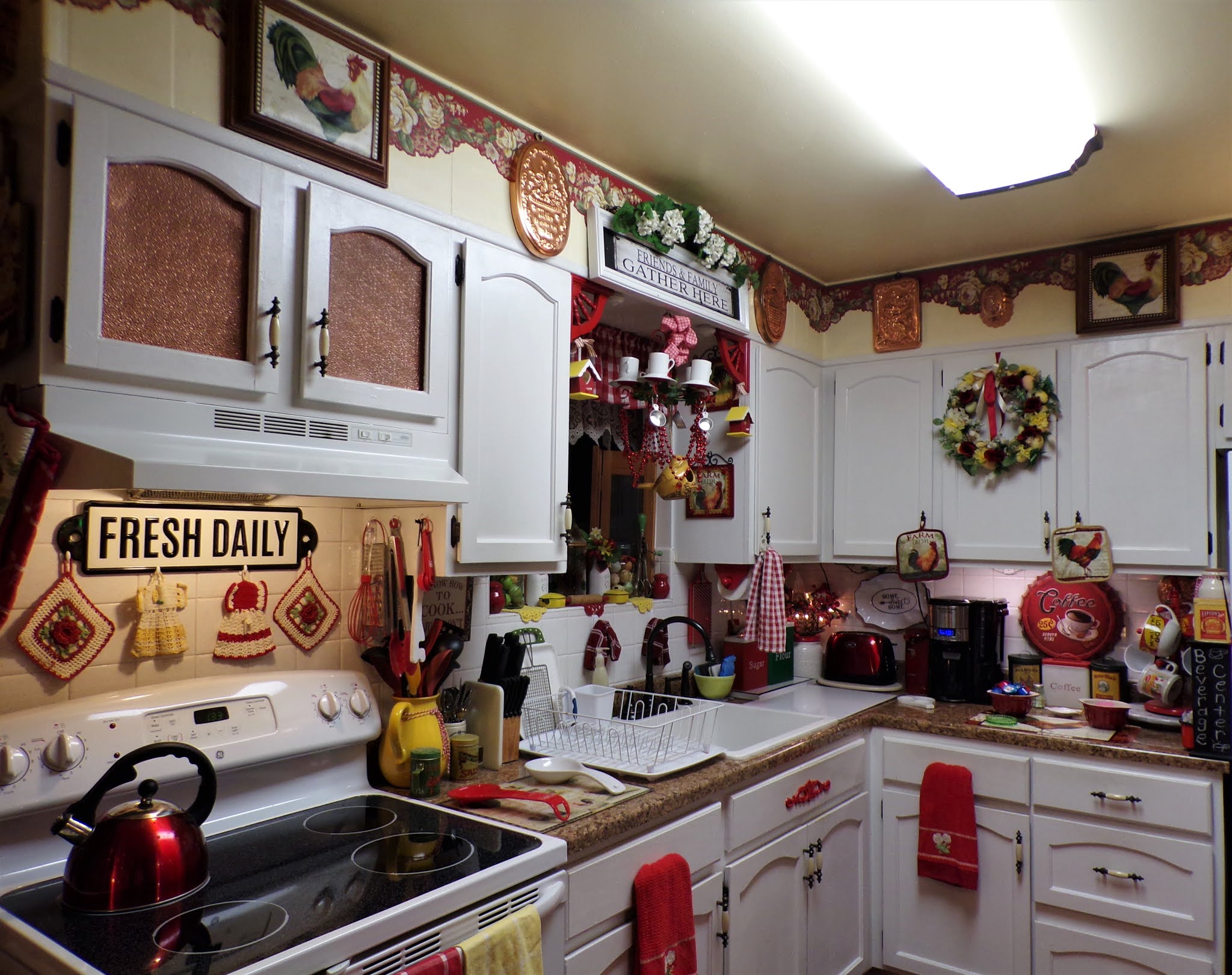 Cute red dish towels with flowers on them hung from the handles of the cabinets and "Chicken" rugs that I bought at J.C. Penney's when we remodeled our Kitchen about 10 years ago......