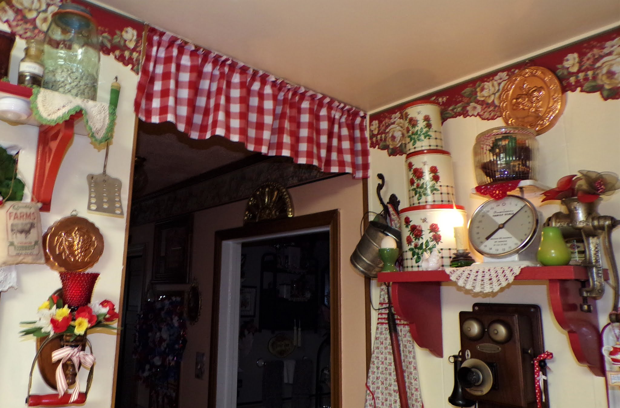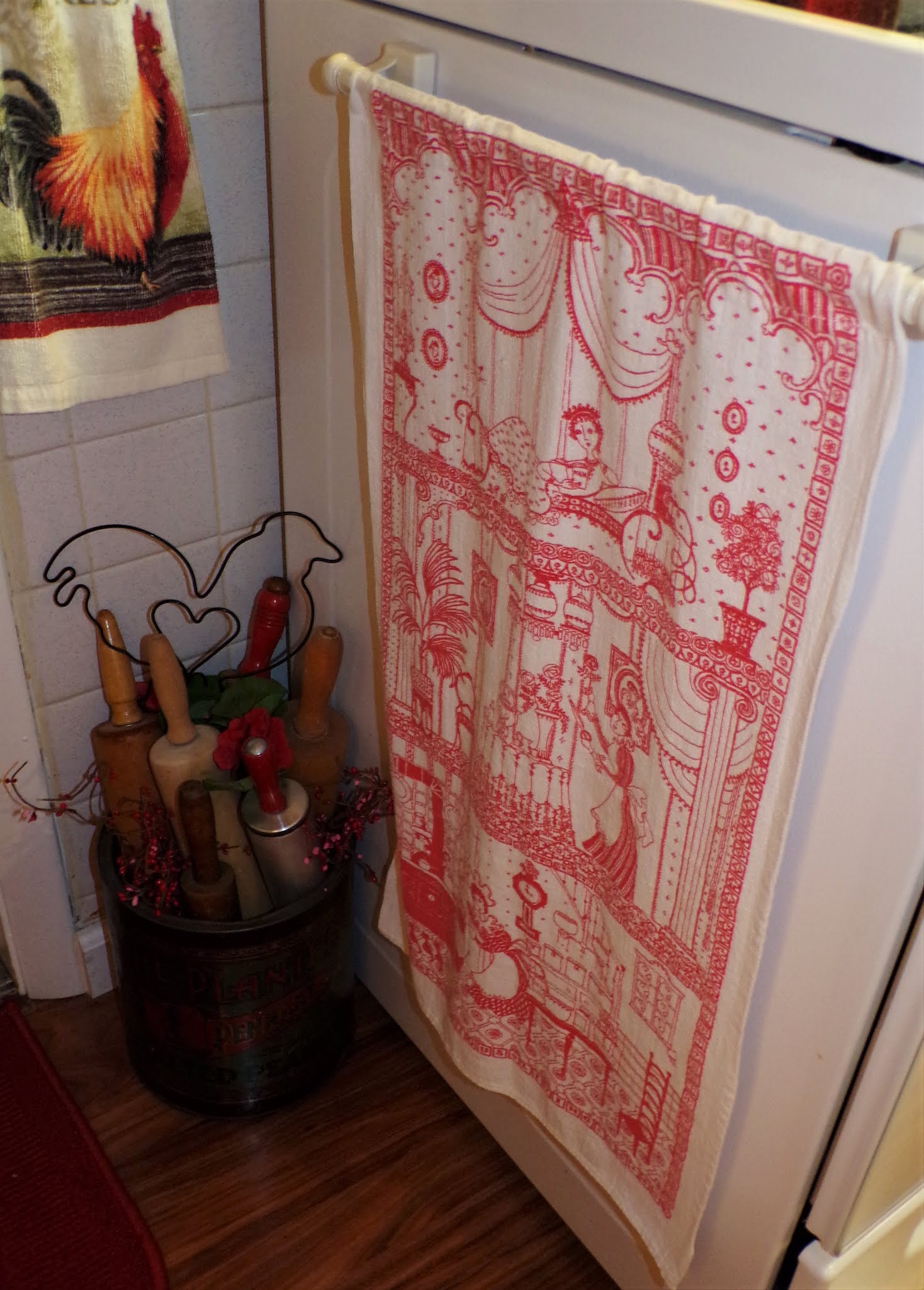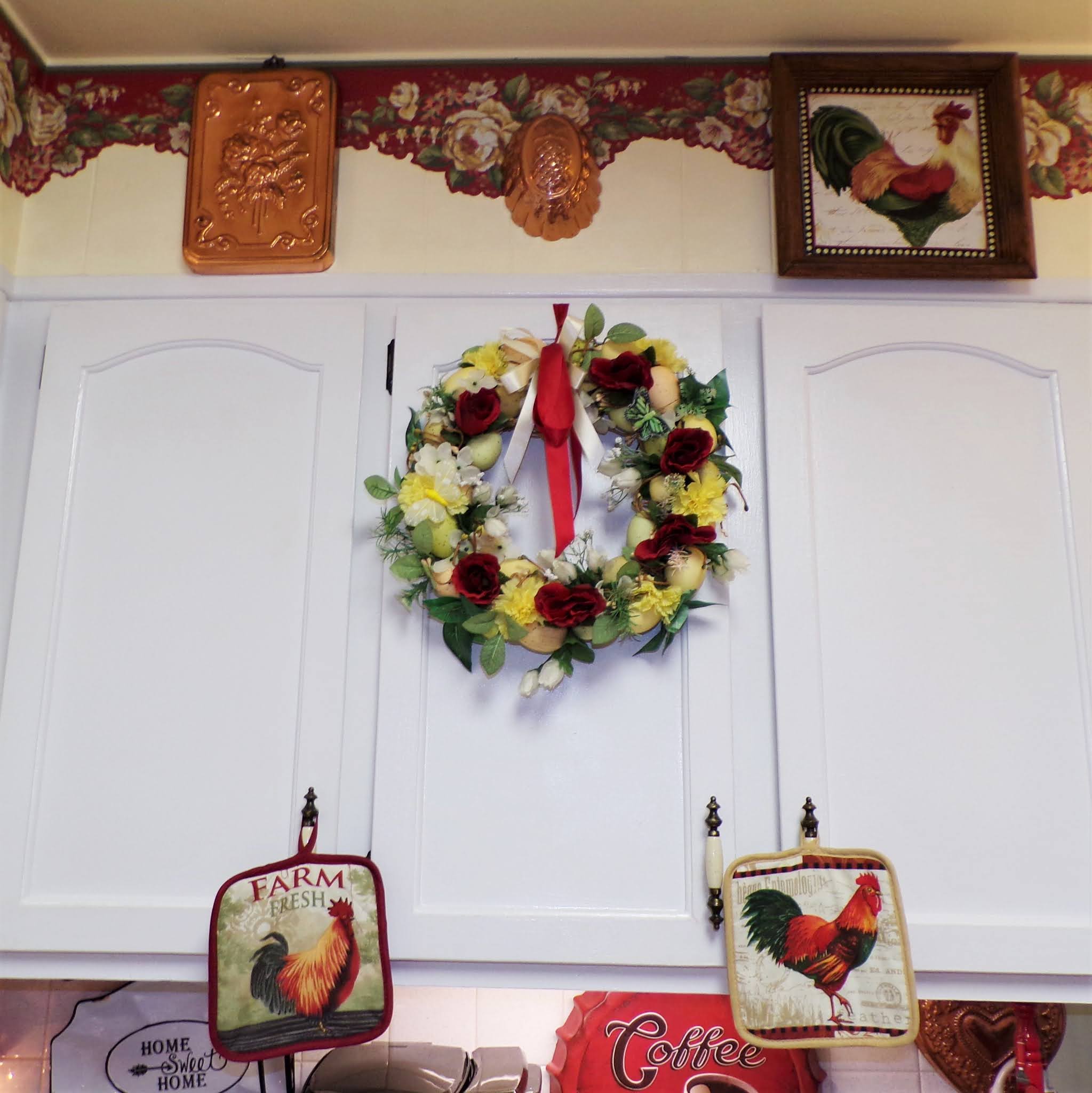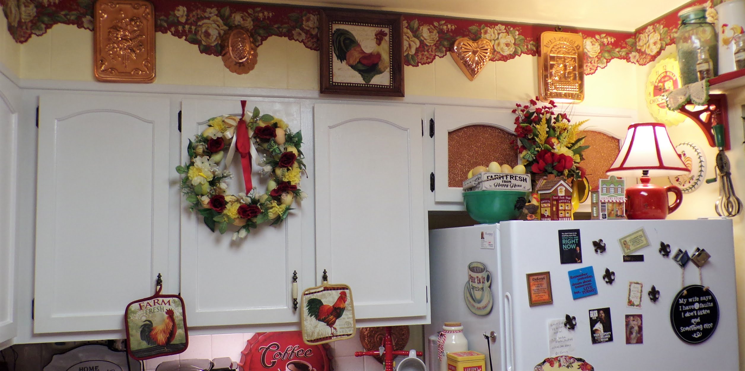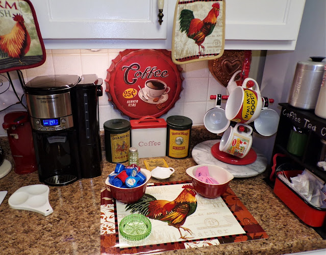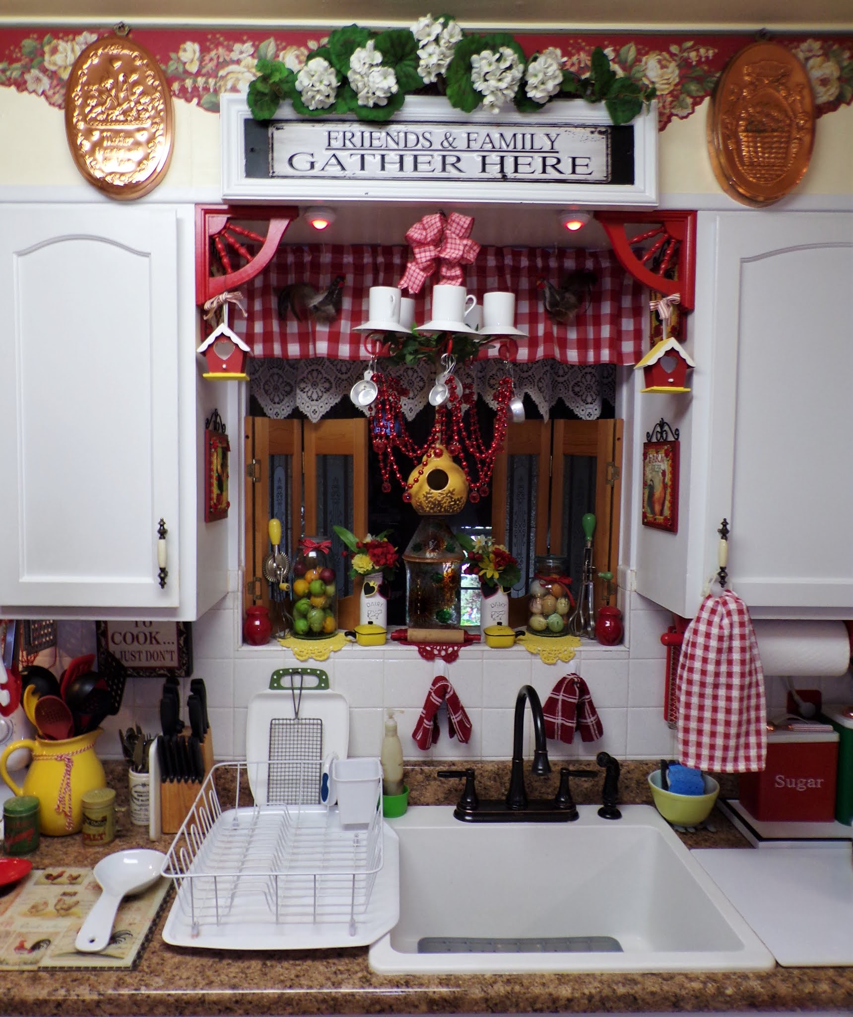 Cute red dish towels with flowers on them hung from the handles of the cabinets and "Chicken" rugs that I bought at J.C. Penney's when we remodeled our Kitchen about 10 years ago......