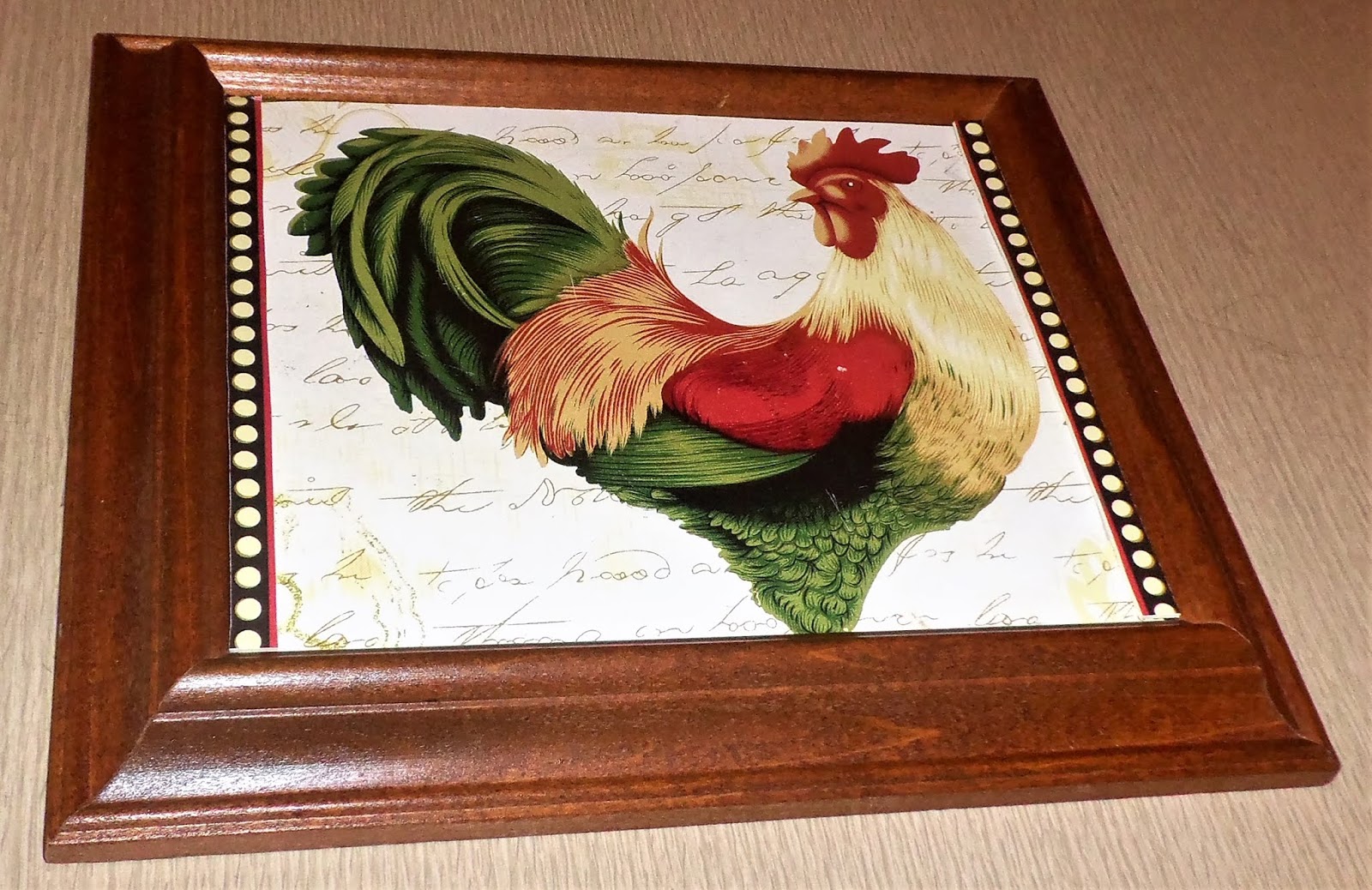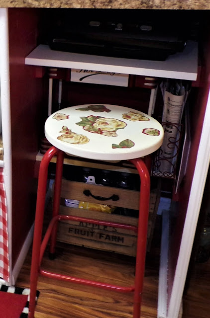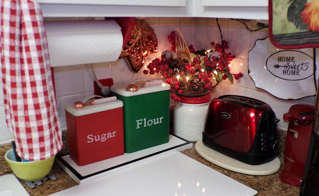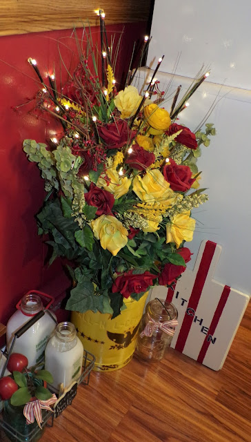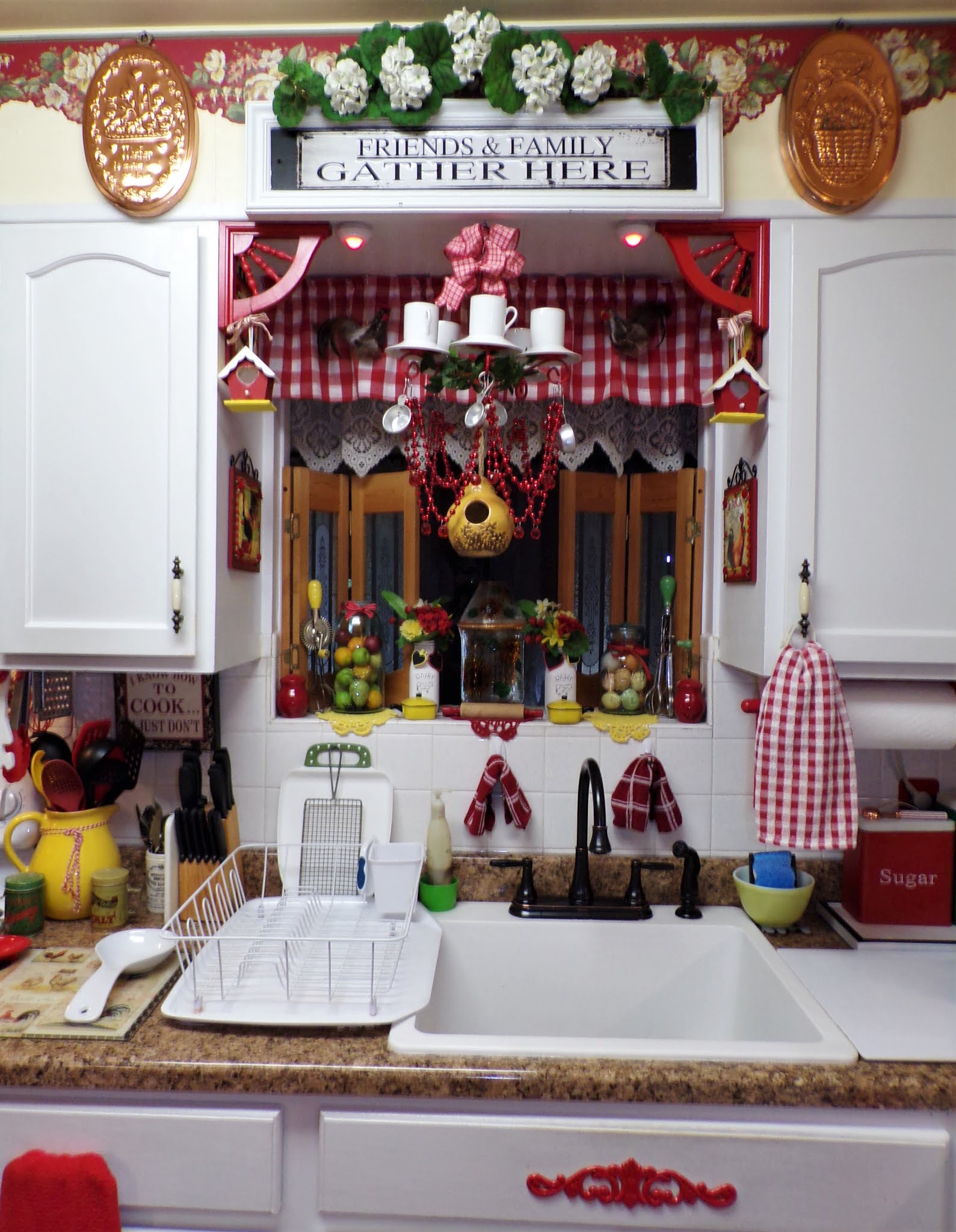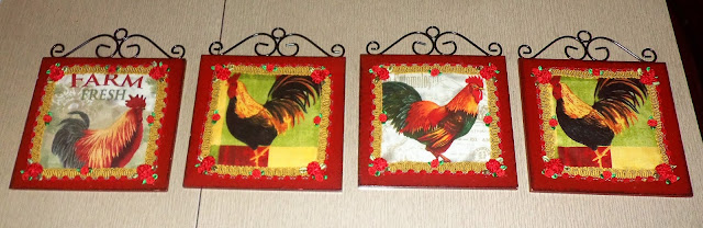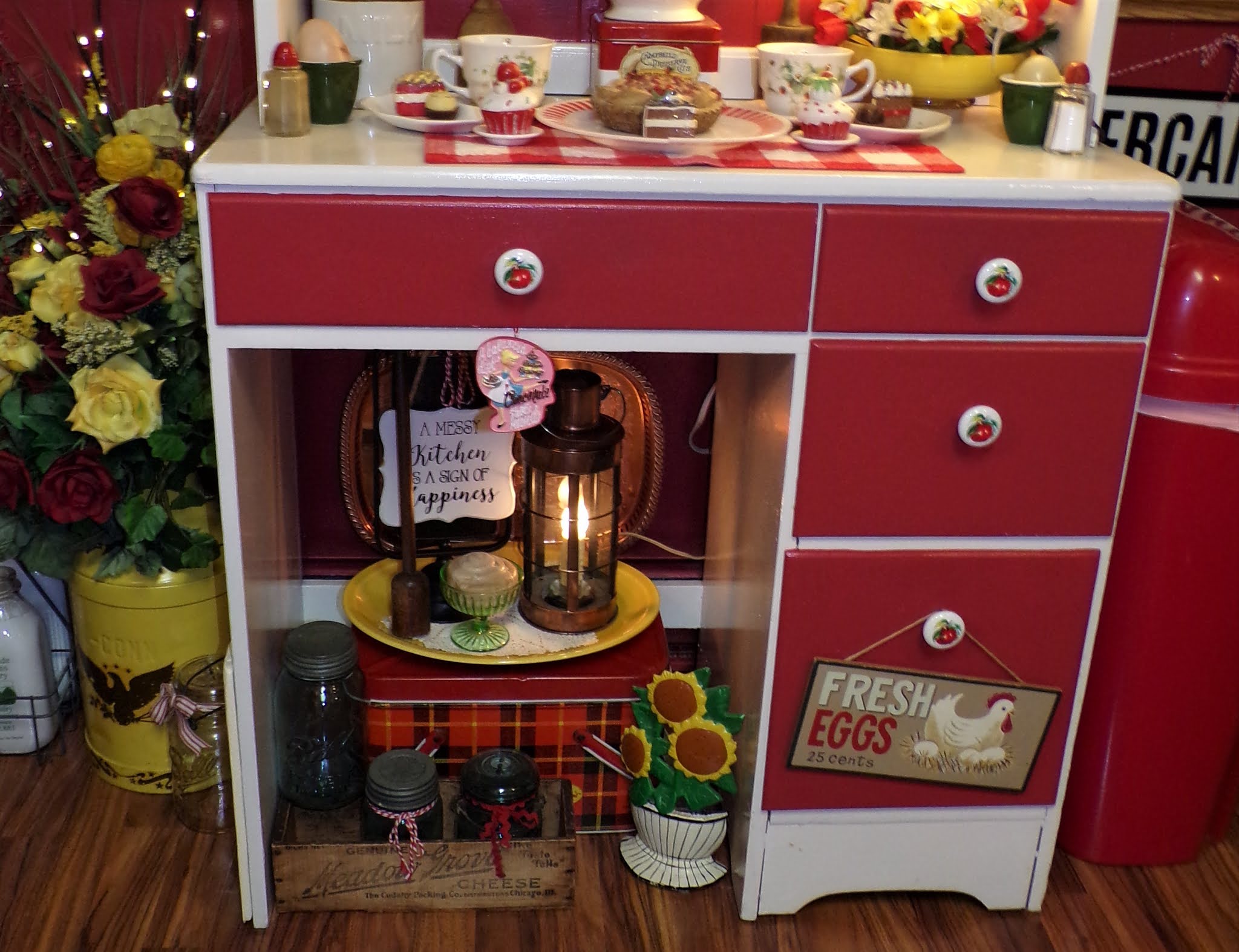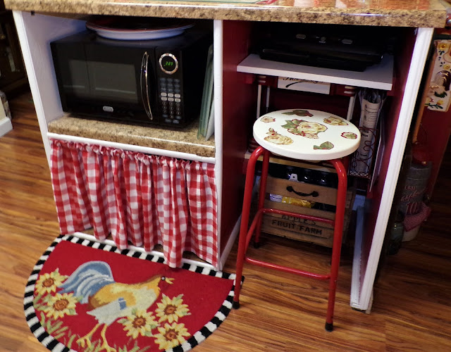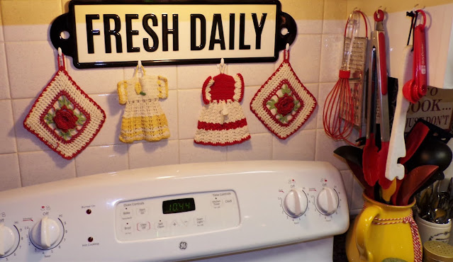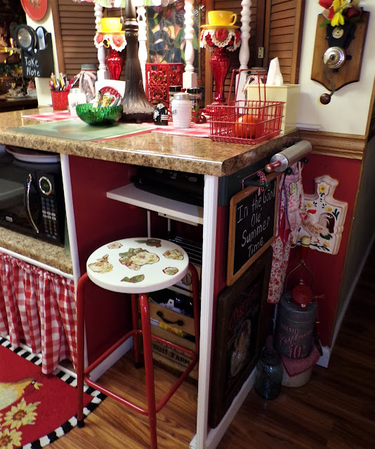 Cute red dish towels with flowers on them hung from the handles of the cabinets and "Chicken" rugs that I bought at J.C. Penney's when we remodeled our Kitchen about 10 years ago......