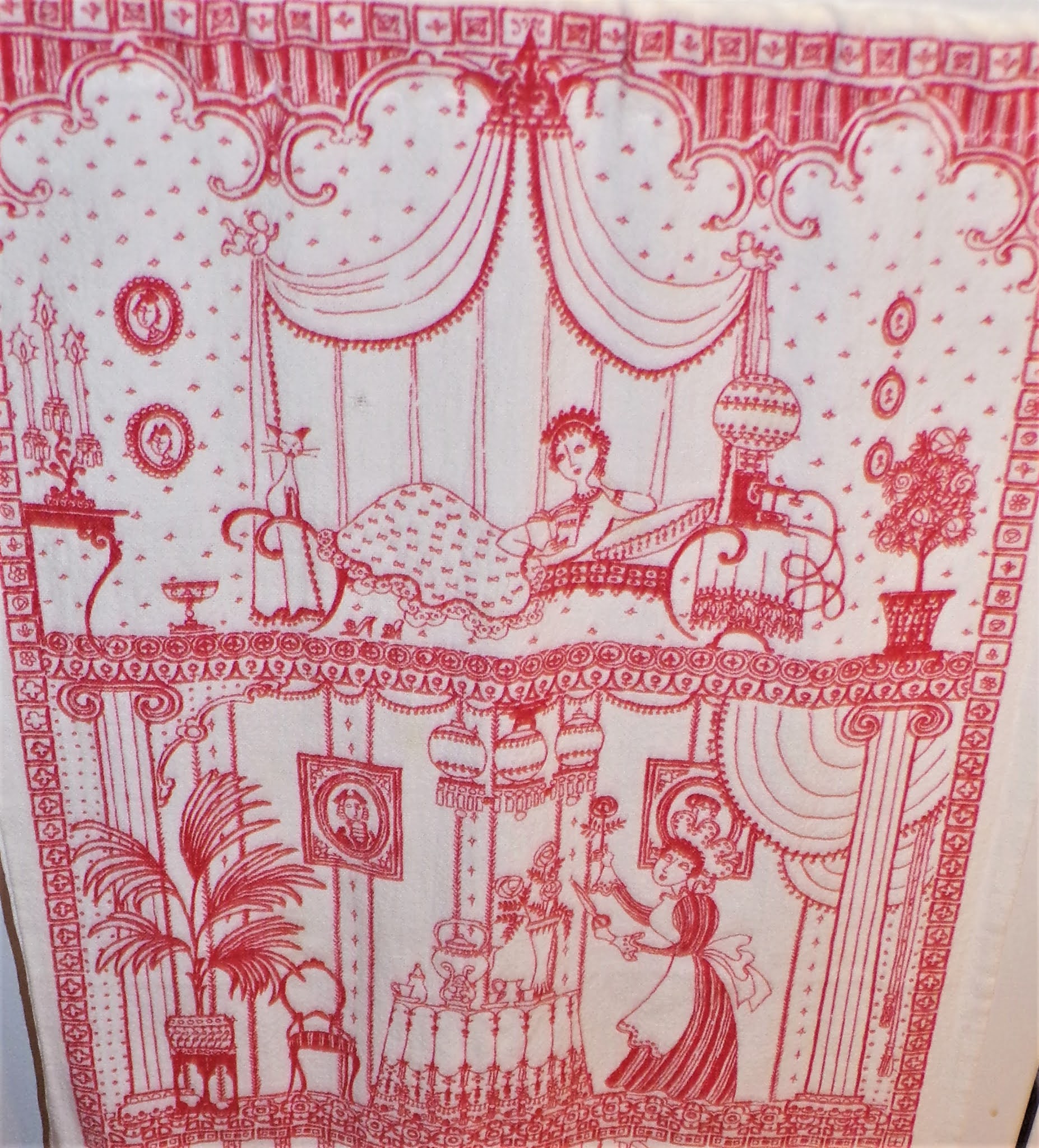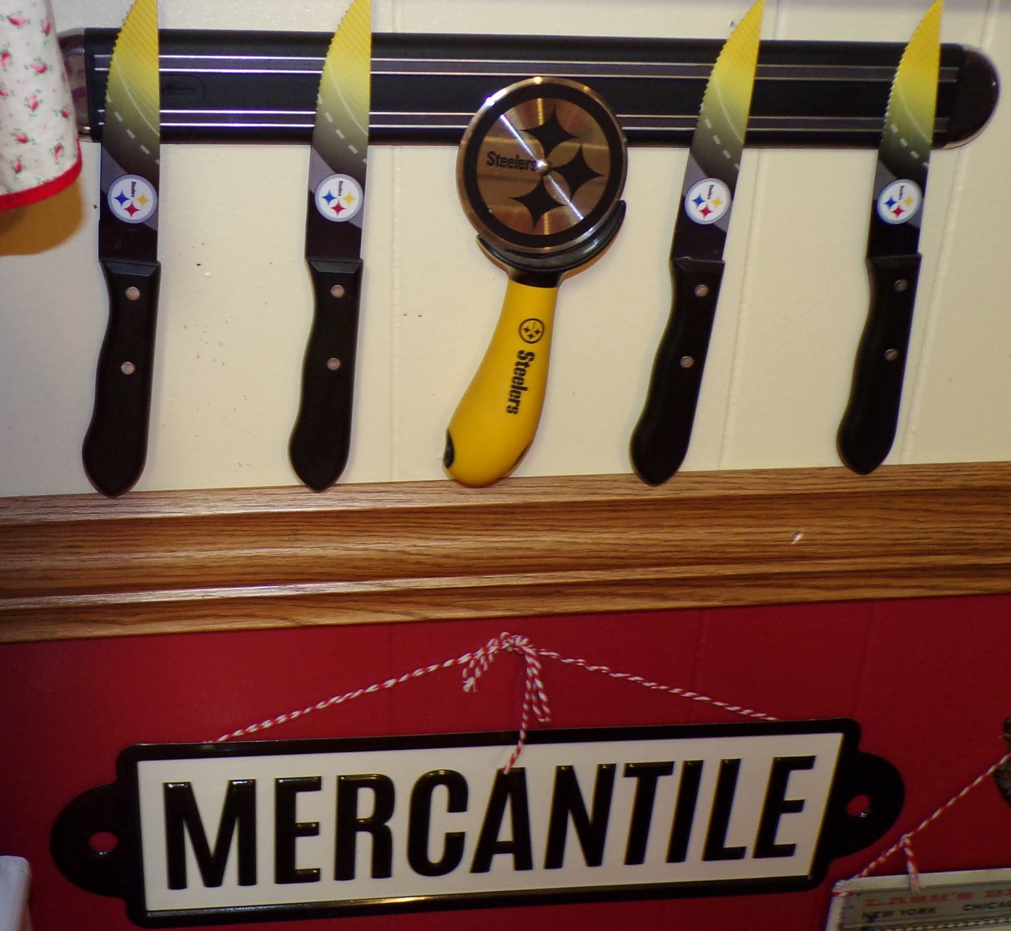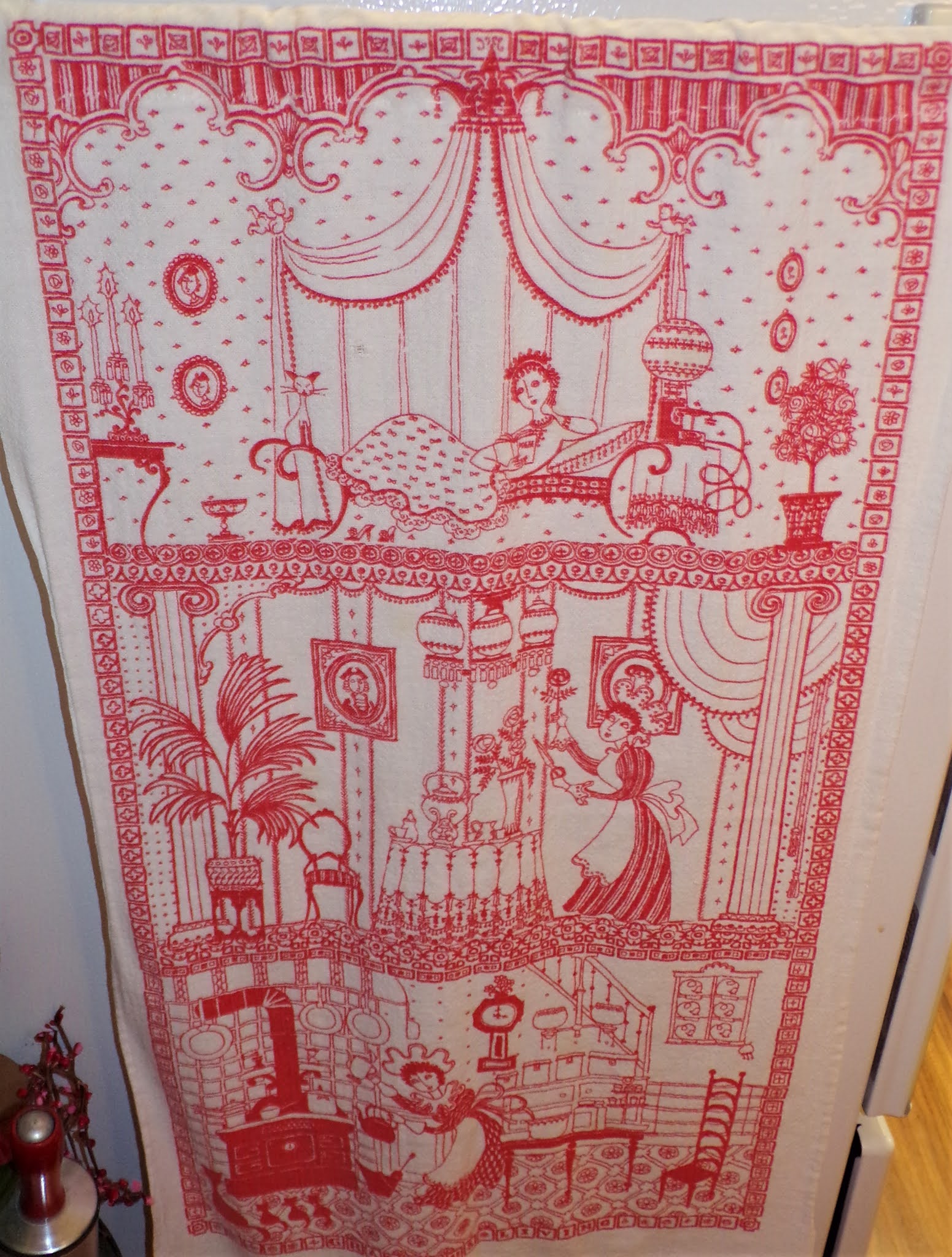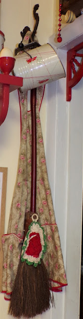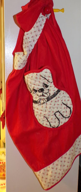 I hung this cute vintage dish towel that I bought at a church rummage sale on a magnetic curtain rod on the side of the stove......