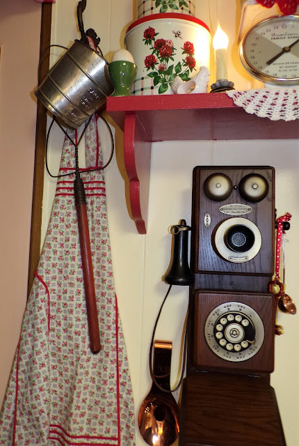 The vintage styled phone, which actually would work if I had that phone jack behind it hooked up, was my neighbor Elly's.....