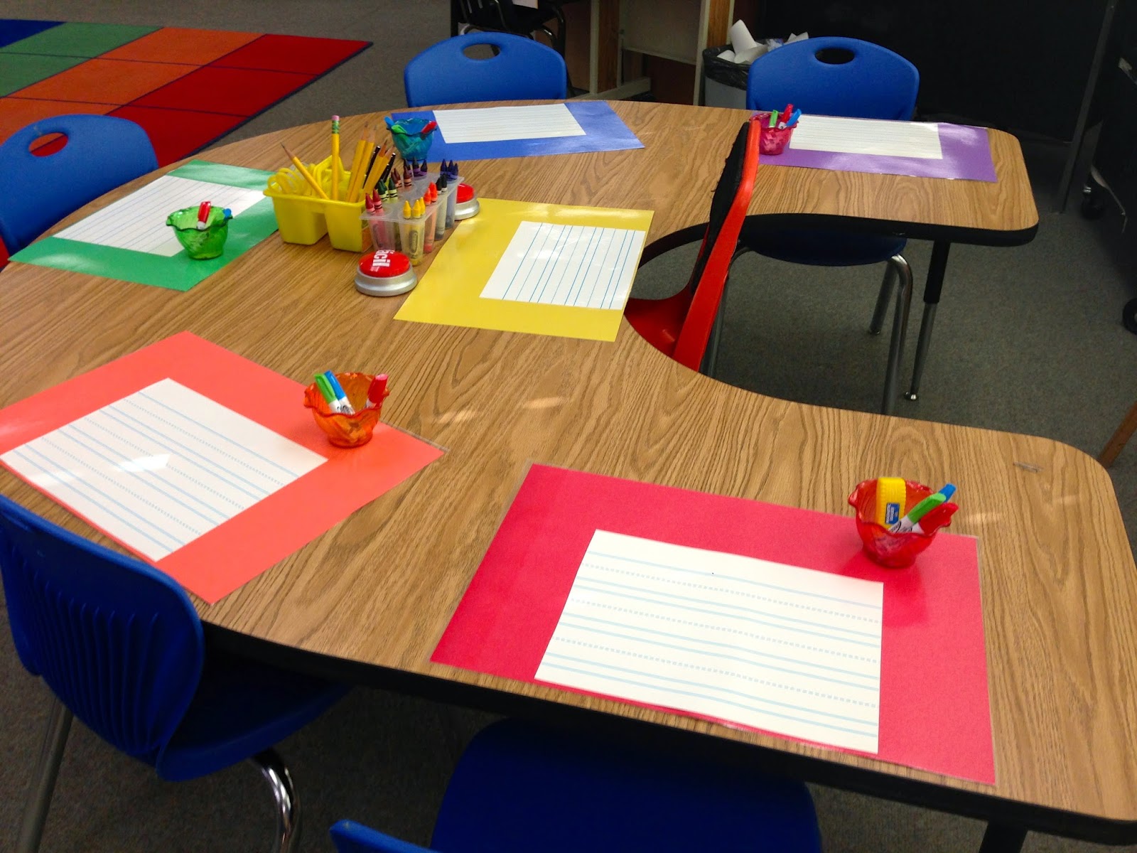 | Even the teacher gets her own mat with lined dry-erase paper attached to it. |