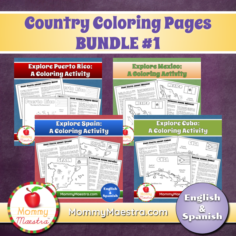 This bundle shows 4, but I have activity packs available for six countries: Mexico, Cuba, Puerto Rico, Spain, Peru, and Venezuela. More countries are on the way, so just check back. Each one introduces children to the country with a printable map for them to color in and fact page with facts numbered to match the images on the map.