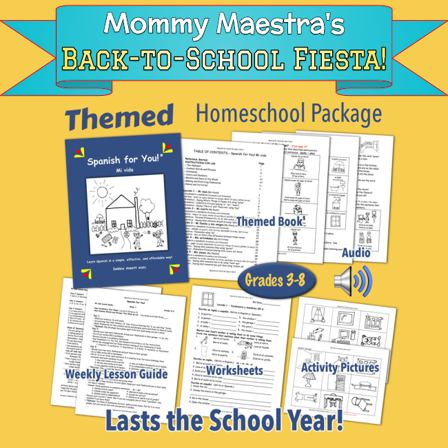 MommyMaestra sponsor, Spanish for You!, is giving away a themed homeschool package for ages 8+/grades 3-4, 5-6, or 7-8 (valued at $42.95) PLUS the coordinating Songs & Lyrics Package ($8.99).