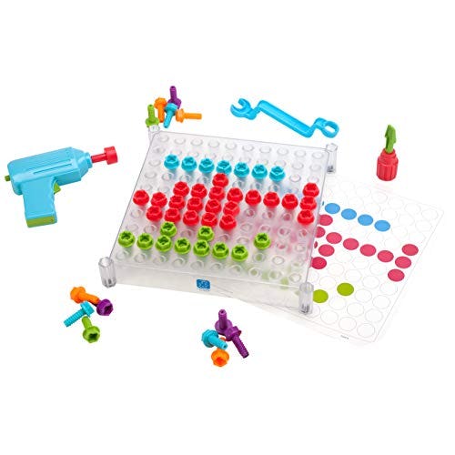 What happens when you give a kid an empty canvas? They put their imagination to work. In this case, they get a clear activity board, 120 chunky plastic bolts, a reversible power drill, a screwdriver, a combination wrench, two drill bits, and 10 pattern cards. And then they go to work, using their gross motor and critical thinking skills to drill the bolts into slots in the board to create whatever pattern they want.
