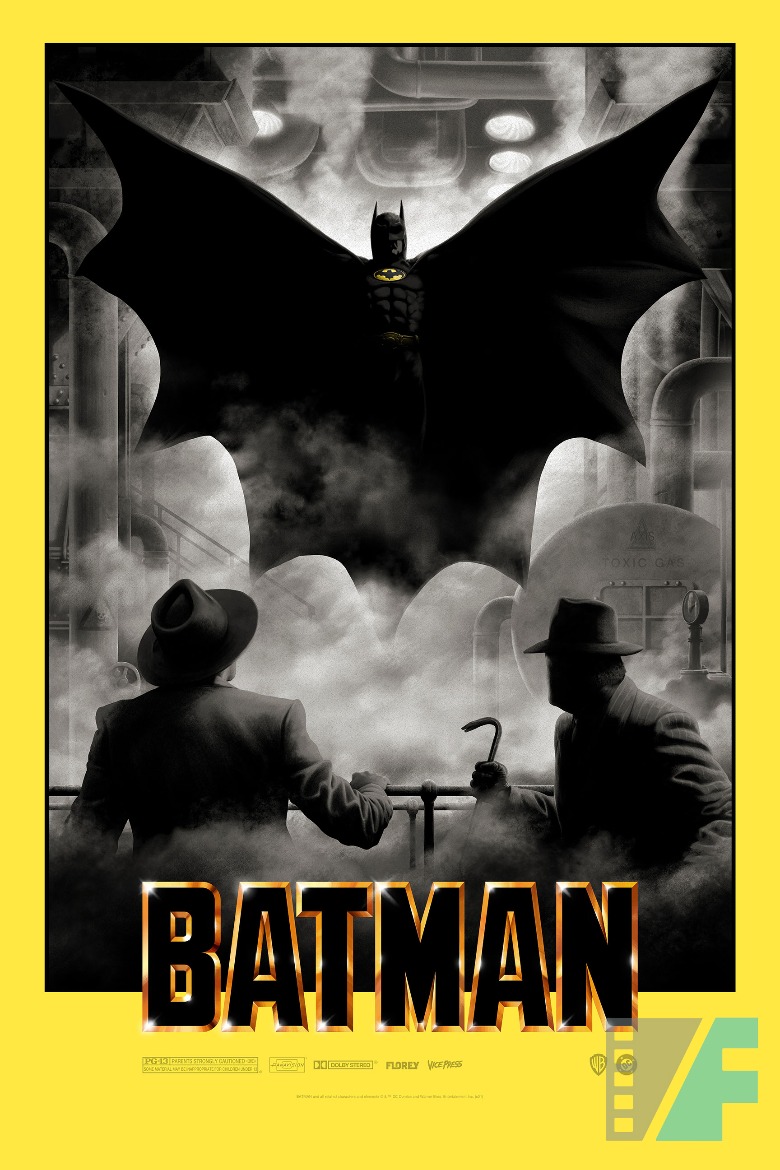 In his newest poster for Vice Press and Bottleneck Gallery, fan fav artist Florey captures the iconic moment Batman descends from the rafters of Axis Chemicals, cementing Keaton's place in comic book cinema history. /Film has got the exclusive look at these new prints, which (for readers of a certain age) will take you back to the glorious summer that made Batman cool again. These new prints even pay tribute to the treasured Topps trading cards for "Batman" that every 9-year-old had to have back then.